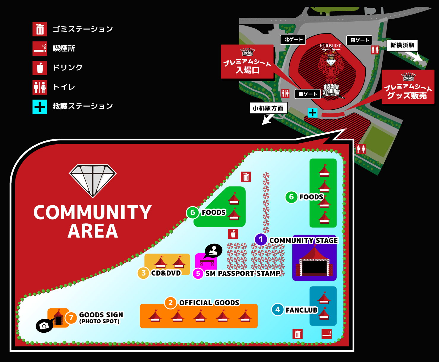 AREA MAP PDF ①COMMUNITY STAGE※6/9と6/10のみ。14:00~14:30 「Dance Dance Dance @ YOKOHAMA 2018」とのコラボ企画! ②OFFICIAL GOODS 『東方神起 LIVE TOUR ~Begin Again~ Special Edition in NISSAN STADIUM』グッズ。 ③CD/DVD 7月25日発売NEW SINGLE「Road」会場限定予約特典決定!! ④FANCLUB 『東方神起 LIVE TOUR ~Begin Again~ Special Edition in NISSAN STADIUM』Bigeastブース会場限定!「Bigeast」新規入会・お友達紹介キャンペーン・継続受付実施決定! ⑤SM PASSPORT STAMP MUSIC NATION SMTOWN PASSPORTに関して ⑥FOODS 日産スタジアム公演 飲食出店メニュー決定!!